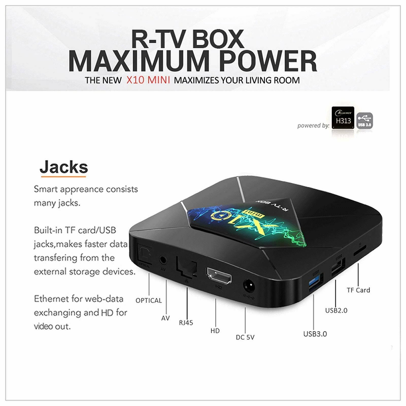 X10mini Box Smart Android TV Box peut transformer votre écran TV et LCD traditionnel en un centre multimédia en se connectant à Internet (via WiFi ou RJ45). Cette Smart TV Box Android vous apportera beaucoup de plaisir et de commodité grâce à ses puissantes fonctionnalités : Android 10.0, chipset Allwinner H313 quad-core 64 bits, processeur Cortex-A55, stockage 2 giga +16 giga et Bluetooth 4.1. Branchez-le simplement sur votre téléviseur et vous êtes prêt à partir !
